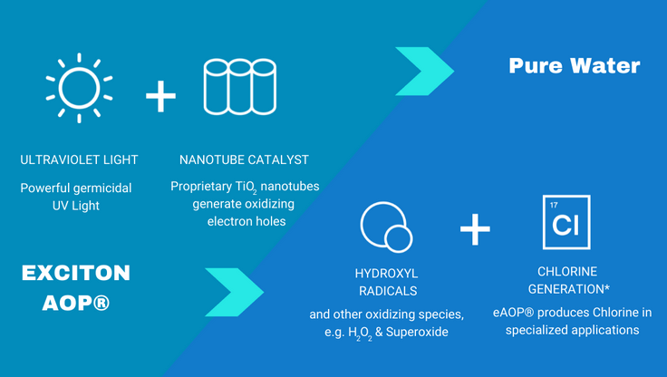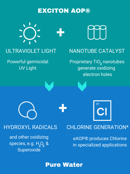 eAOP® combines UV light and our proprietary nanotube photocatalyst to produce hydroxyl radicals and/or chlorine.